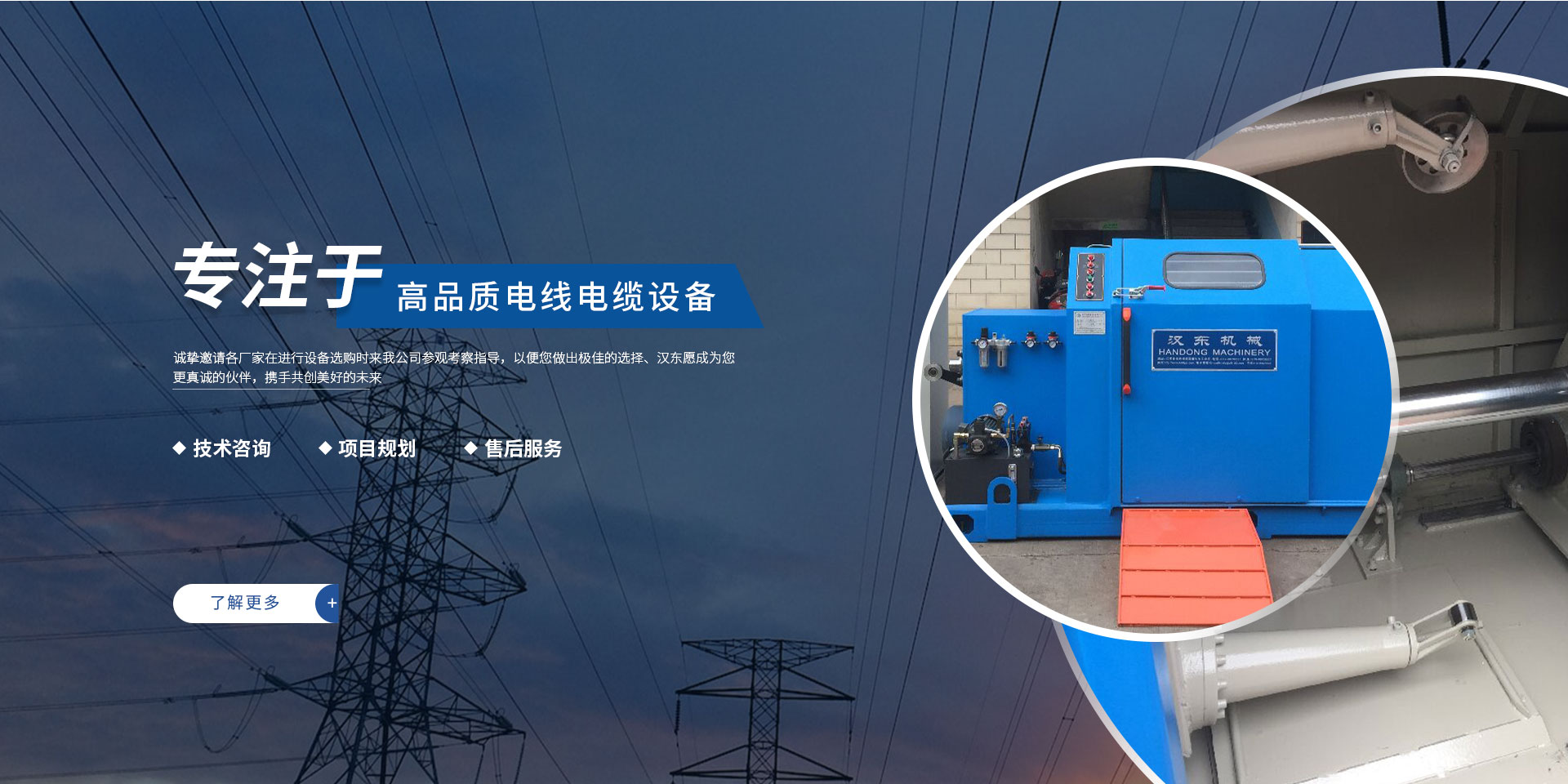 常州漢東機(jī)械始創(chuàng)于2006年,是集電線電纜機(jī)械設(shè)計、開發(fā)、制造、安裝、調(diào)試為一體化的高科技企業(yè)。本公司自開業(yè)以來,積極引進(jìn)日本,歐美等國外電線電纜設(shè)備之先進(jìn)技術(shù),先后成功推出了達(dá)到行業(yè)先進(jìn)水平的電線電纜設(shè)備,主要產(chǎn)品有擠出、繞包、束線、成纜等電線電纜固定設(shè)備。在提供系統(tǒng)設(shè)備的同時,還向客戶提供售前技術(shù)咨詢、項目規(guī)劃、以及售后服務(wù)。我公司本著“以人為本、科技先導(dǎo)、用戶為上”的宗旨,為客戶提供牢靠的產(chǎn)品與省心的服務(wù)。漢東愿成為您更真誠的伙伴,攜手共創(chuàng)美好的未來! 了解更多+大核心優(yōu)勢